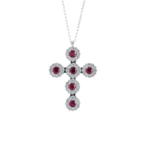 Collana in oro bianco 18 kt, croce con diamanti e pietre preziose