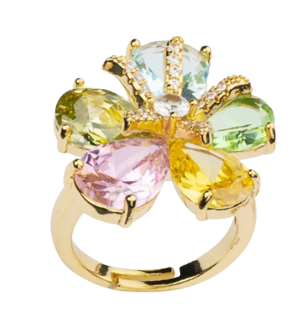 Gambo in brass dorato e top a fiore con cristalli dal taglio a goccia multicolore e zirconi clear.