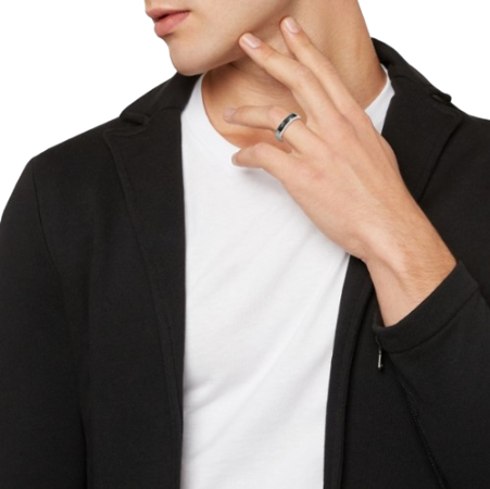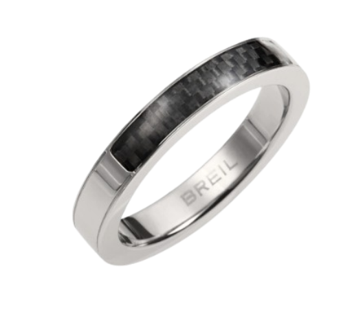 L’anello da uomo B.C.6 è in acciaio lucido e presenta un sottile inserto in fibra di carbonio che rende il gioiello estremamente moderno.