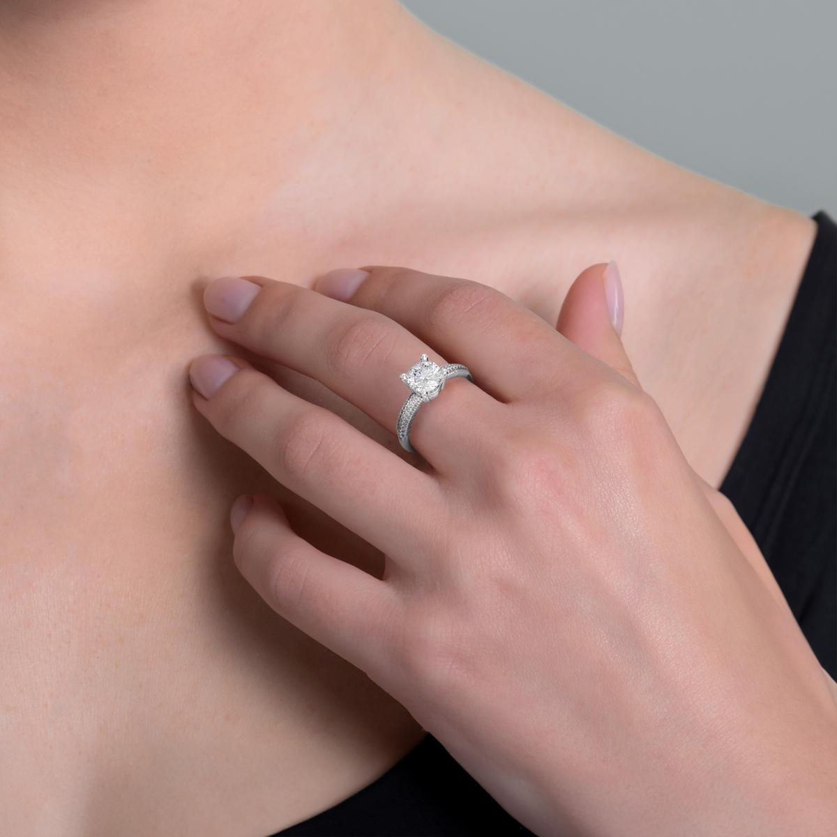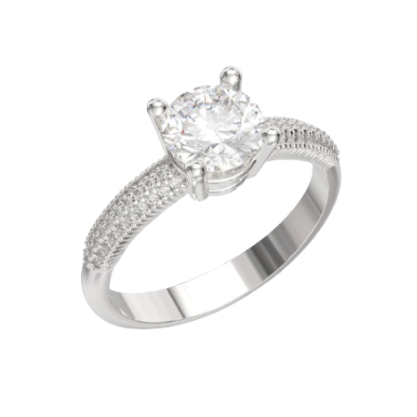 Anello Solitario in oro 18kt bianco rodiato con Diamanti incastonati anche nel gambo. Disponibile in diverse carature di Diamante centrale.