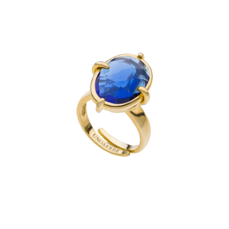 Anello donna con pietra blu, placcato oro, forma ovale e misura regolabile. Pietre colorate e design fashion che trae ispirazione dai vivaci tessuti dei shari indiani. Un anello cocktail dal design italiano, contemporaneo ed elegante perfetto per valorizzare il tuo stile. Scegli il colore che preferisci ed abbinalo agli altri gioielli della collezione.