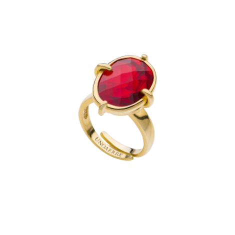 Anello con pietra rossa, bronzo dorato, forma ovale e misura regolabile. Design prezioso e pietre brillanti ispirate ai colori vivaci dei shari e dei festival indiani. Un anello cocktail luminoso ed elegante disponibile in diversi colori da scegliere ed abbinare ai gioielli della collezione Jaipur per un look esotico che ti farà innamorare.