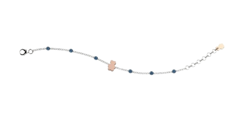 Delizioso bracciale in argento impreziosito da perline azzurre e dal dolcissimo orsetto Tato.