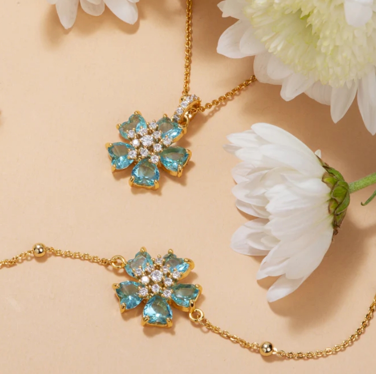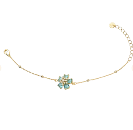 Bracciale con catenina rolò con sferette lisce in brass dorato e fiore centrale con cristalli aquamarine e zirconi clear.