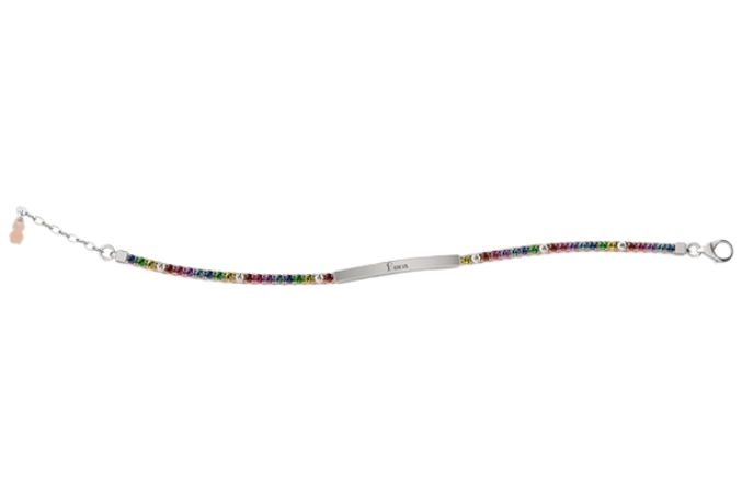 Il raffinato bracciale tennis in puro argento della linea Nanàn Bijou per la mamma, reso unico e speciale dalla targhetta centrale personalizzabile. VERSIONE MULTICOLOR.
