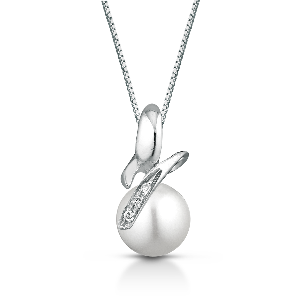 Curve sinuose in oro bianco che accarezzano delicatamente l’unica perla del ciondolo,