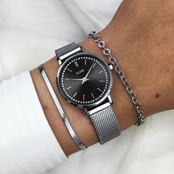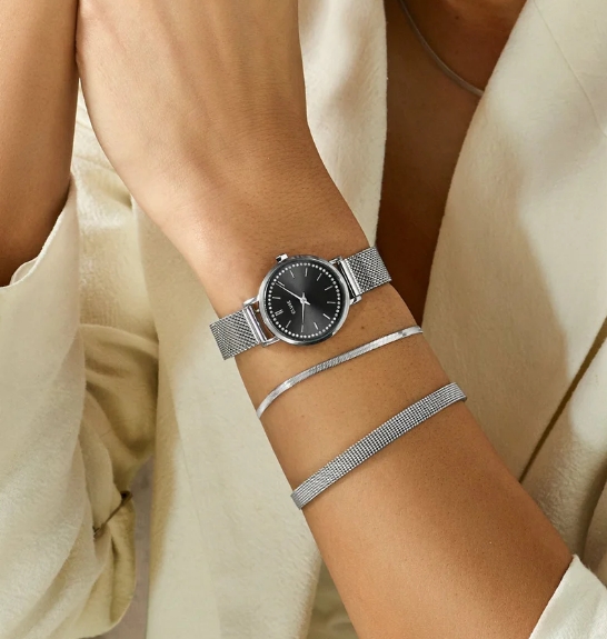 Piccoli orologi per sognare in grande. Con la sua raffinata cassa da 28 mm, la nostra collezione Boho Chic Petite è il tuo compagno perfetto se preferisci un orologio più piccolo. Caratterizzato da un elegante quadrante nero, incantevoli decorazioni in cristallo e una cassa e un cinturino color argento senza tempo. Questo orologio completerà ogni look. Grazie alla cassa in acciaio inossidabile e al cinturino in maglia, questo orologio è costruito per durare.