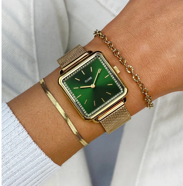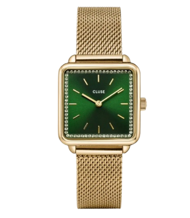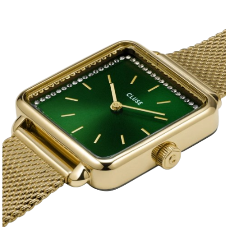 Tuffati nella pura eleganza con l’orologio da donna CLUSE La Tétragone in un sorprendente colore oro e verde. Il suo caratteristico quadrante quadrato verde, ornato da delicati abbellimenti in cristallo, si abbina perfettamente al lussuoso cinturino in maglia color oro. Sebbene originariamente facesse parte del nostro celebre cofanetto regalo, questo articolo autonomo è una dichiarazione in sé, portando senza sforzo un tocco di raffinatezza al tuo polso. Come per tutti gli orologi della collezione La Tétragone, i cinturini di questo orologio possono essere sostituiti con qualsiasi cinturino per orologio CLUSE da 16 mm.