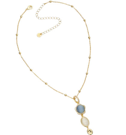 Collana con catenina saturno in brass dorato con fiore pendente in pavè di zirconi e pietre cat eye bianco e celeste