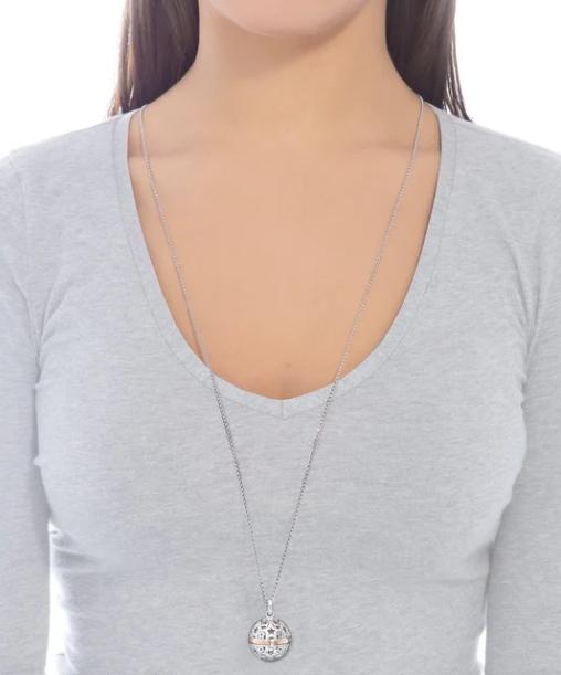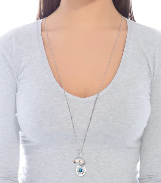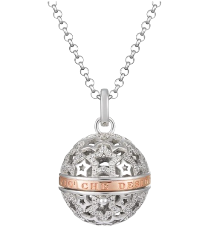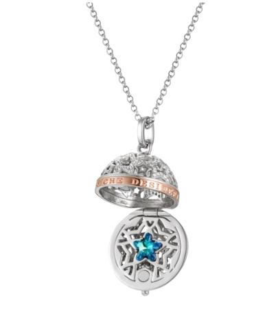 Il Chiama Angeli ” tutto ciò che desideri ” è un meraviglioso pendente che nasconde al proprio interno una luminosa pietra blu, simbolo di amore e protezione. La collana è arricchita anche da una fascia centrale in argento rosato che dona un tocco glamour e moderno ad un gioiello dalla bellezza senza tempo.