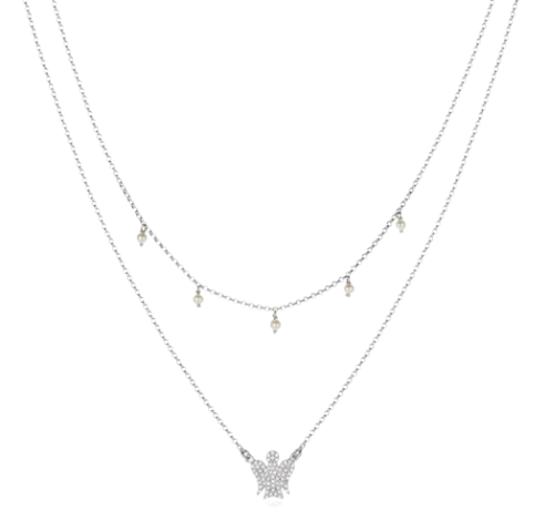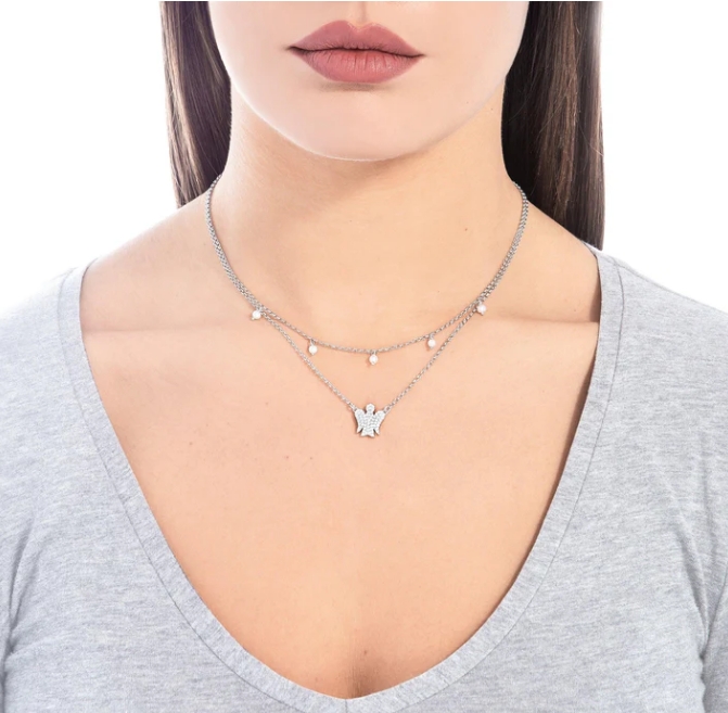 Bellissima questa collana che illumina il decolletè di chi la indossa donando fascino ed eleganza. Regalalo ad una donna di classe, che ama lo stile e la moda con un tocco angelico di luce. L’originalità e lo stile di questa collana conquisterà al primo sguardo. La prima catena ha 5 graziose ed eleganti perle che regalano quel tocco di classe in più mentre la seconda ha il bellissimo e luminoso pendente Angelo in argento illuminato da una miriade di piccoli zirconi bianchi.