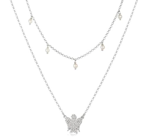 Collana a doppia catena con perle, angelo in argento e zirconi bianchi.