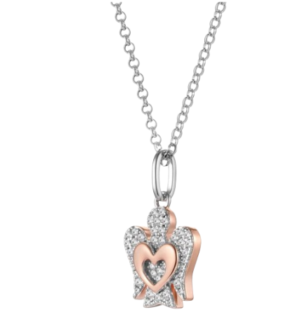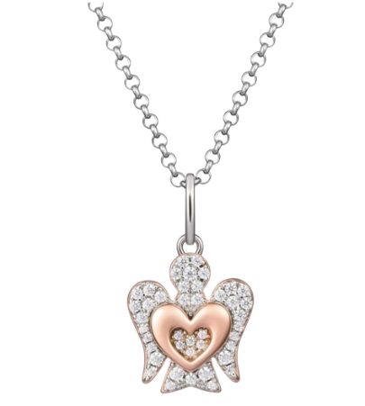 Collana con pendente Angelo in argento rosato con cuore e zirconi bianchi.
