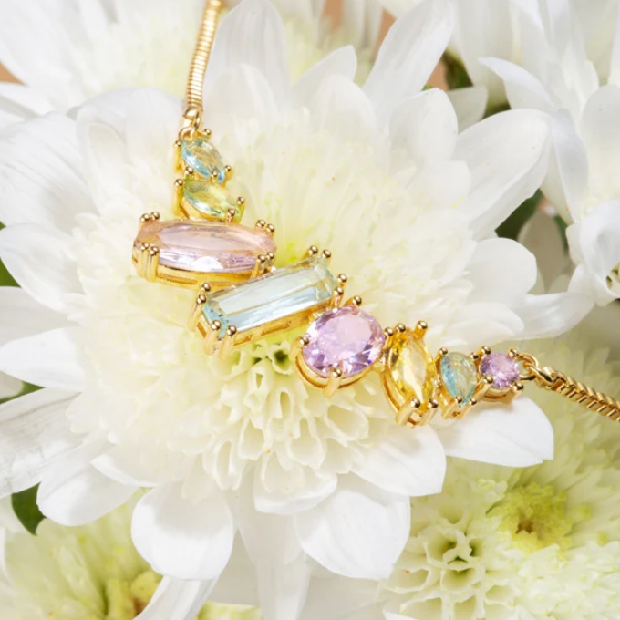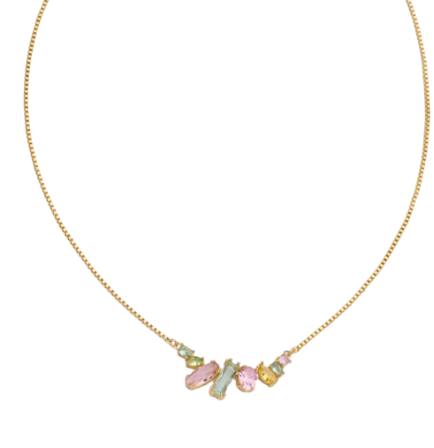 Collana con catenina veneziana in brass dorato con centrale in cristalli dal taglio mix peridot, aquamarine, light rose e citrino.