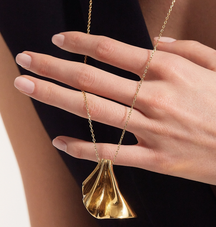 La collana da donna Plissè non ha bisogno di descrizioni. Basta guardarla per rimanere affascianti dalle forme morbide ed eleganti. La sottile catenina regolabile in lunghezza è arricchita da un pendente in acciaio lucido color oro che sembra animarsi e creare mille piccole pieghe che creano una splendida luce che illumina ogni look.