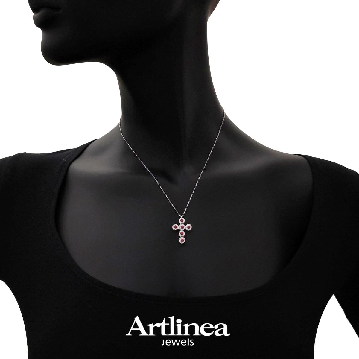 Collana in oro bianco 18 kt, croce con diamanti e pietre preziose