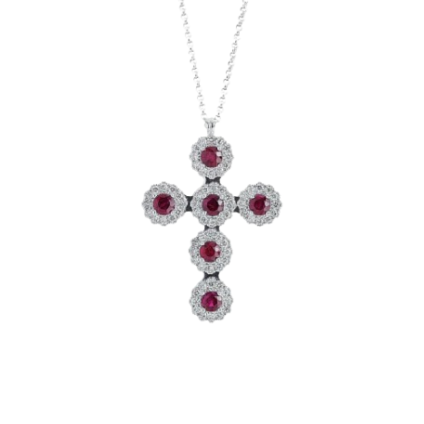 / Collana in oro bianco 18 kt, croce con diamanti e pietre preziose