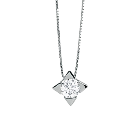 Collana punto luce classico in Oro 18kt bianco rodiato impreziosita da un diamante disponibile in diversi ct. La collana con catena veneziana misura 42 cm mentre il pendente a stella ha una larghezza di 1 cm.