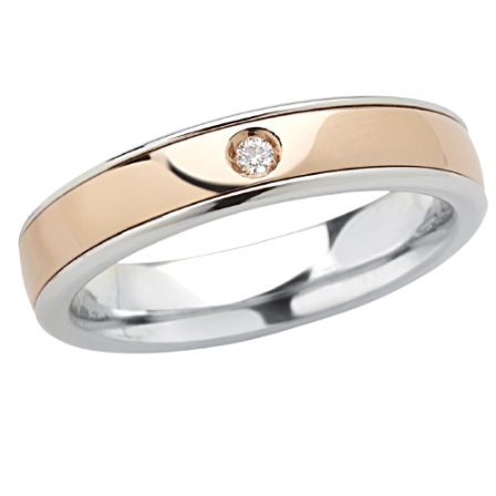 Fede in Oro 18kt bicolore disponibile in combinazione di Oro bianco e rosa oppure bianco e giallo con finitura lucida. Anello largo 4,5 mm con incassato un Diamante bianco naturale taglio Brillante. Ordinabile in tutte le misure e personalizzabile con incisione interna gratuita.
