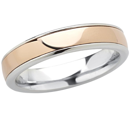 Fede in Oro 18kt bicolore disponibile in combinazione di Oro bianco e rosa oppure bianco e giallo con finitura lucida. Anello largo 4,5 mm, ordinabile in tutte le misure e personalizzabile con incisione interna gratuita