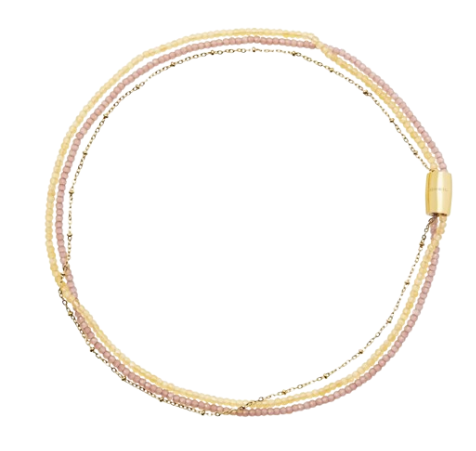 Magnetica System è la collezione di gioielli che, grazie ai suoi diversi elementi e alle chiusure magnetiche, può essere modificata e assumere forme e stili sempre diversi. Il girocollo Paradise abbina una catena ball chain in acciaio color oro a due fili di cristalli, in color giallo e lilla. Può essere indossato da solo o abbinato ad ogni altro elemento della collezione, per creare nuove collane di diverse lunghezze.