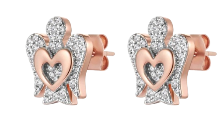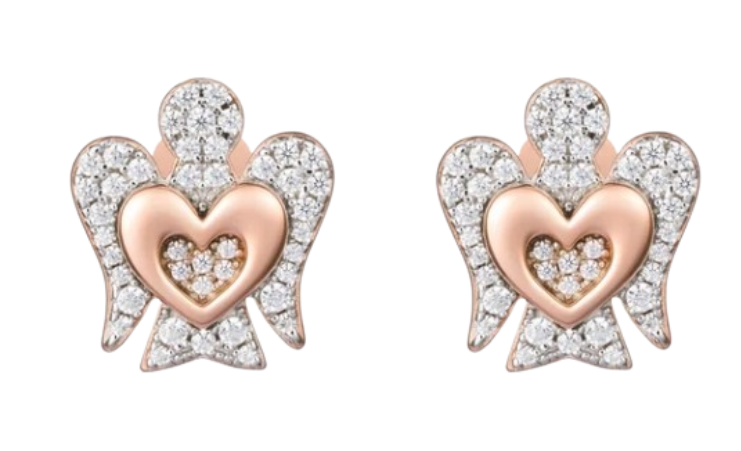 Orecchini con angelo in argento rosato, con cuore e zirconi bianchi.