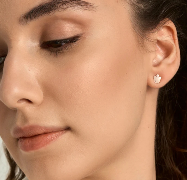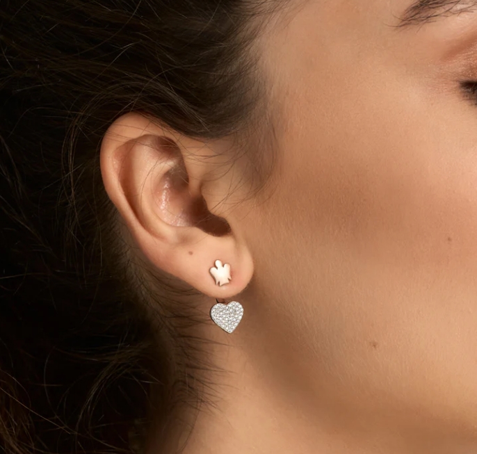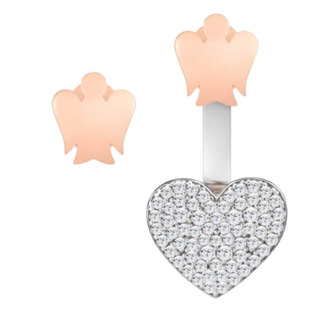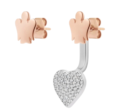 Orecchini asimmetrici con cuore pavé e angelo in argento rosato.