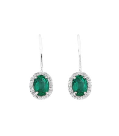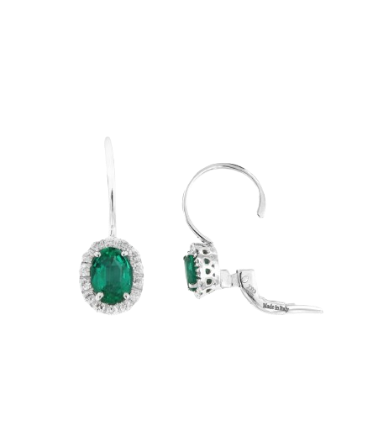 Orecchini Davite & Delucchi per Donna. Orecchini Pendenti rosetta in oro bianco 18 carati con diamanti naturali da 0,14 carati – colore G – purezza VS e smeraldi da 0,80 carati totali.