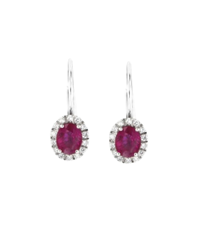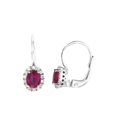 Orecchini Davite & Delucchi per Donna. Orecchini Pendenti rosetta in oro bianco 18 carati con diamanti naturali da 0,14 carati – colore G – purezza VS e rubini, dal taglio ovale, da 0,95 carati totali.