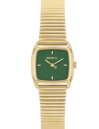 L’orologio da donna Stylize prende ispirazione dai tratti tipici dell’Art Decò, caratterizzata da forme geometriche e linee ripetute. L’orologio solo tempo in acciaio lucido color oro ha la cassa di forma che si adatta anche ai polsi più piccoli, abbinata a un bracciale a fitte maglie zigrinate. Il quadrante minimal e pulito è verde brillante, un colore che mostra la sua massima eleganza se abbinato al color oro.
