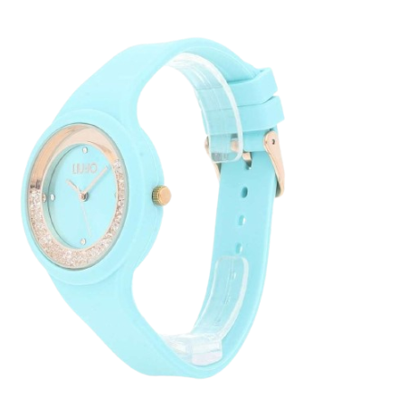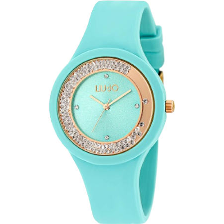 Orologio solo tempo da donna della collezione dancing sport. Orologio con cassa in acciaio inossidabile di colore gold rose e del diametro di 38 mm. Vetro minerale e quadrante di colore turquoise con cristalli sciolti nella lunetta. Cinturino in silicone di colore turquoise. Resistenza all’acqua di 3 atm e movimento quartz seiko pc21. La referenza è tlj1425