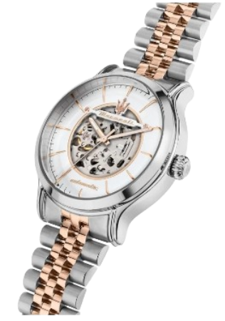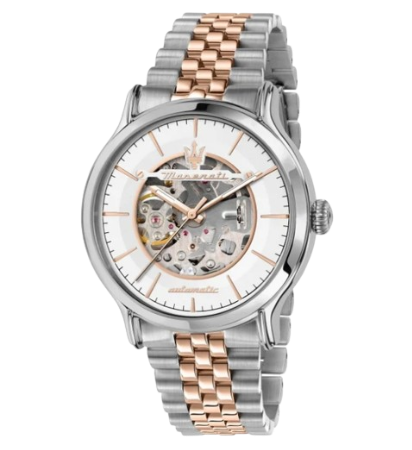 OROLOGIO MASERATI EPOCA – R8823118011 – Genere: Uomo, Materiale e finitura cassa: Acciaio, Misura cassa: 42mm, Spessore cassa: 13,35, Finitura cassa: Lucido, Colore cassa: Silver, Vetro: Trattamento vetro zaffiro, Materiale cinturino: Metallo, Colore cinturino: Silver, Oro rosa, Chiusura: Fibbia deployante con pulsanti, Movimento: Automatico, Water resistant: 10 atm, Garanzia: Ufficiale 2 anni Maserati, Confezione: Originale Maserati