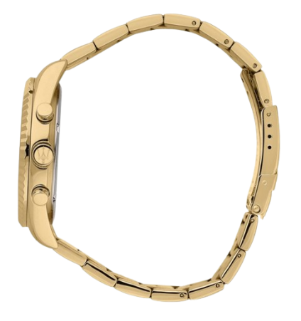 Cassa in acciaio inox con finitura dorata dal diametro di 43 mm. Fondello e corona a vite. Quadrante analogico blu con indici a bastoni, logo nella parte alta e datario con giorno del mese e della settimana. Cinturino in acciaio anallergico gold; chiusura deployante con pulsanti. Resistente all’acqua fino a 100 metri di profondità. Appartiene a collezione Competizione.