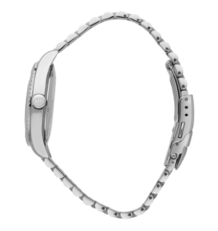 Vetro zaffiro. Cinturino jubilee in acciaio anallergico; chiusura deployante con pulsanti.