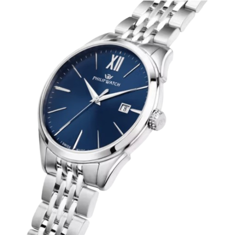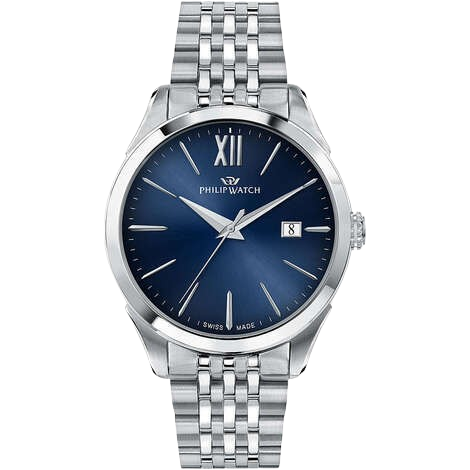 Orologio Philip Watch Roma, solo tempo uomo. Cassa in acciaio silver da 41 mm, quadrante blu con indici e lancette silver, datario alle ore 3, movimento al quarzo, e vetro zaffiro. Cinturino in acciaio silver e impermeabilità di 5 atm.