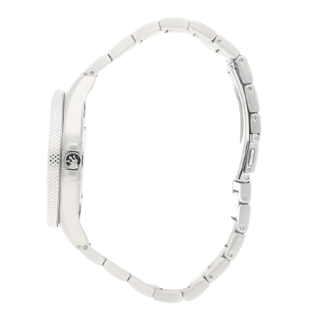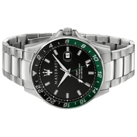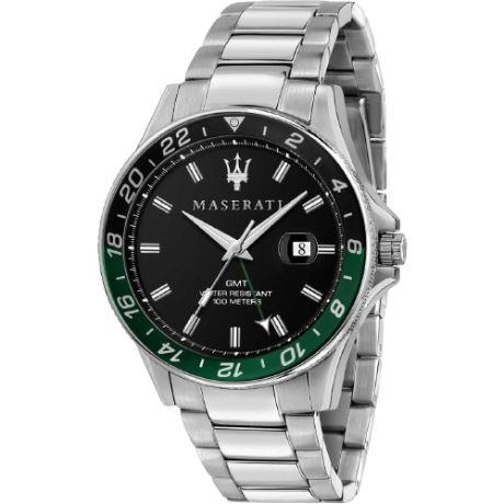 Orologio da Uomo solo tempo Maserati della collezione Sfida, cassa in acciaio con finitura satinato del diametro di 44 mm e spessore di 10,90 mm , corona e cassa a vite, cinturino in acciaio colore silver e quadrante nero con ghiera nero/verde. La chiusura del cinturino è a Fibbia diver con blocco sicurezza.