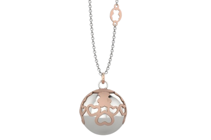 Pendente con ciondolo a boule dorato, impreziosito da un piccolo orsetto e cuoricini rifiniti in color oro.